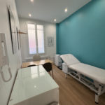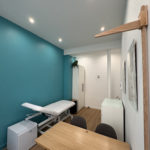 Cabinet de 12,5 m² comprenant un espace de consultation, une table d’examen, un plan de travail et des espaces de rangement, un point d’eau, la climatisation, une toise murale, service DASRI, draps d’examen, podoscope, imprimante…