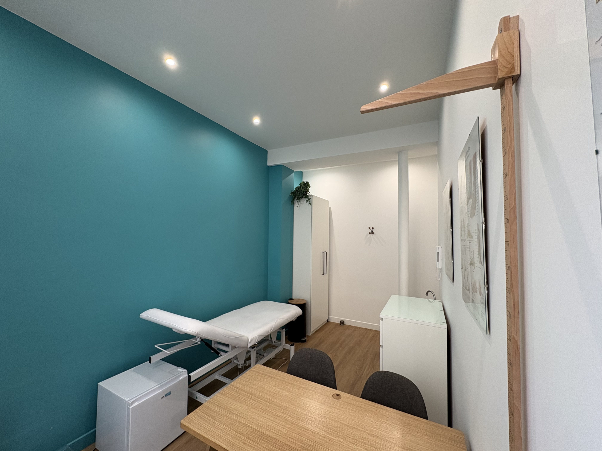 Cabinet de 12,5 m² comprenant un espace de consultation, une table d’examen, un plan de travail et des espaces de rangement, un point d’eau, la climatisation, une toise murale, service DASRI, draps d’examen, podoscope, imprimante…